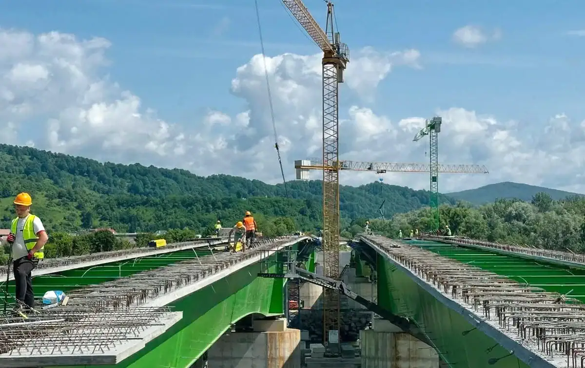 Нове мостове рішення передбачає два незалежні паралельні прогони – по одному для зустрічних потоків транспорту. На майданчику вже зосереджена спеціальна техніка та робочі бригади, а над річищем річки встановлюється довгий металевий прогін. Монтажні роботи ведуться одночасно з обох берегів Тиси і просуваються інтенсивно.
