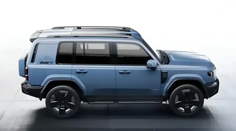 Спереду iCar V27 нагадує Defender – великі круглі фари та впізнавана радіаторна решітка. Ззаду ж – відсилання до Prado 250: масивні стійки даху, вертикальні ліхтарі та «човник» із коробом, що імітує чохол із запасним колесом.