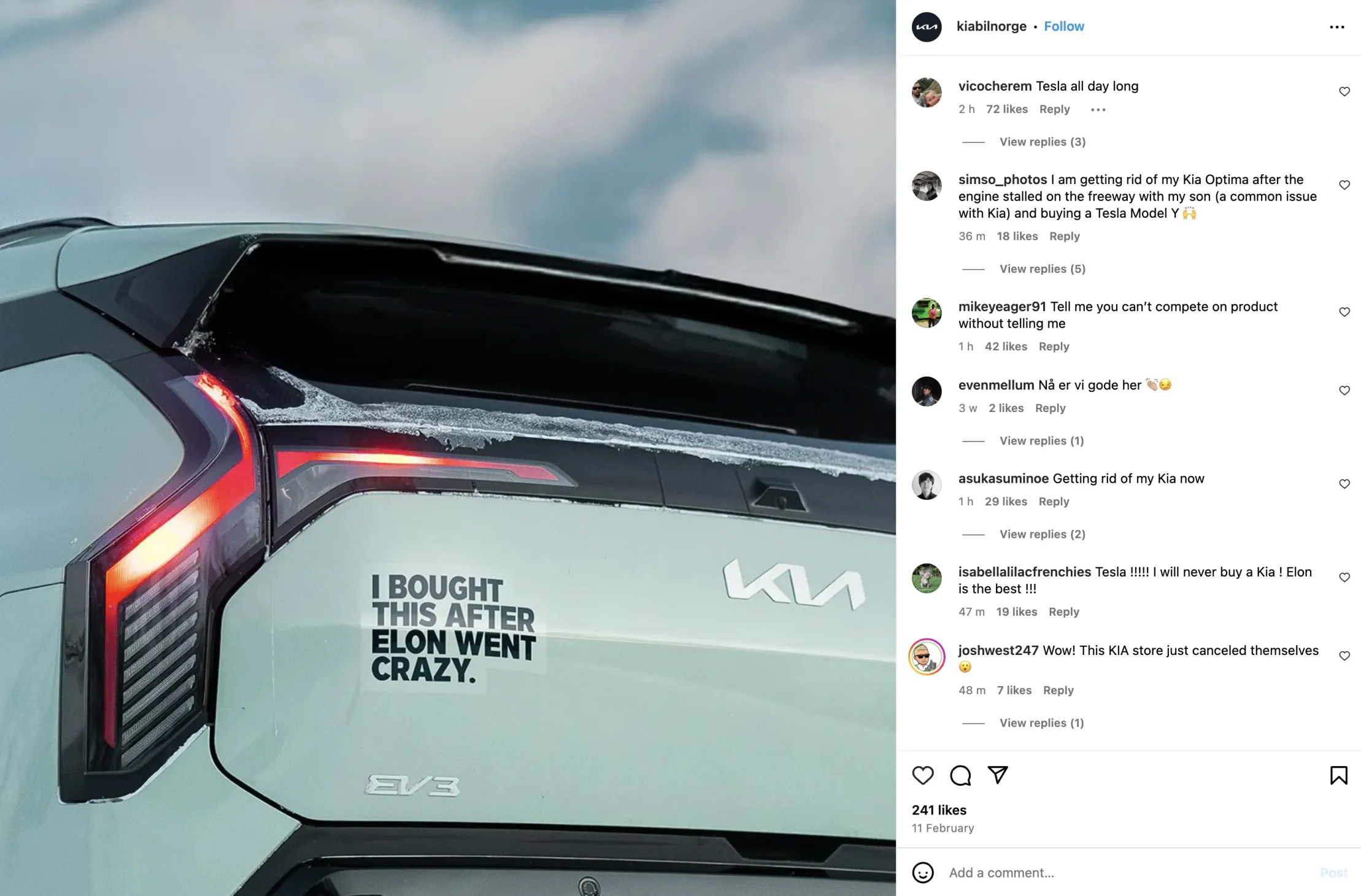 Після того, як Ілон Маск увійшов до команди новообраного президента США Дональда Трампа і активно вплутався в політику, він почав видавати одну за одною скандальні заяви, зокрема про Україну та Європу. То він публічно «зігує», то підтримує ультраправих на виборах у Німеччині, то ображає президента України Володимира Зеленського та прем’єра Канади Джастіна Трюдо. Після цього власники електрокарів Tesla почали клеїти на свої автівки наклейки «Я купив це до того, як Маск збожеволів», щоб дистанціюватись від скандального міль’ярдера. Це у підсумку і стало приводом для жарту Kia.