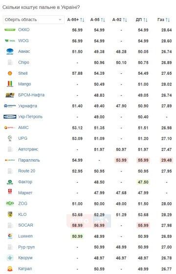 Ціни на паливо на різних АЗС виглядають так: