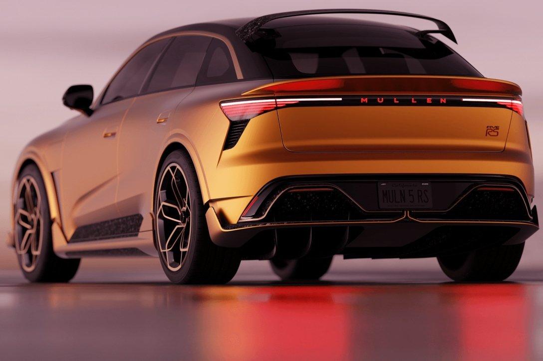 Електрокросовер Mullen Five – це стрімке купе довжиною 4,9 метра. Спортивна версія RS відрізняється агресивним дизайном передньої частини, аеродинамічним обвісом, антикрилом на даху і дисками діаметром 21 дюйм.