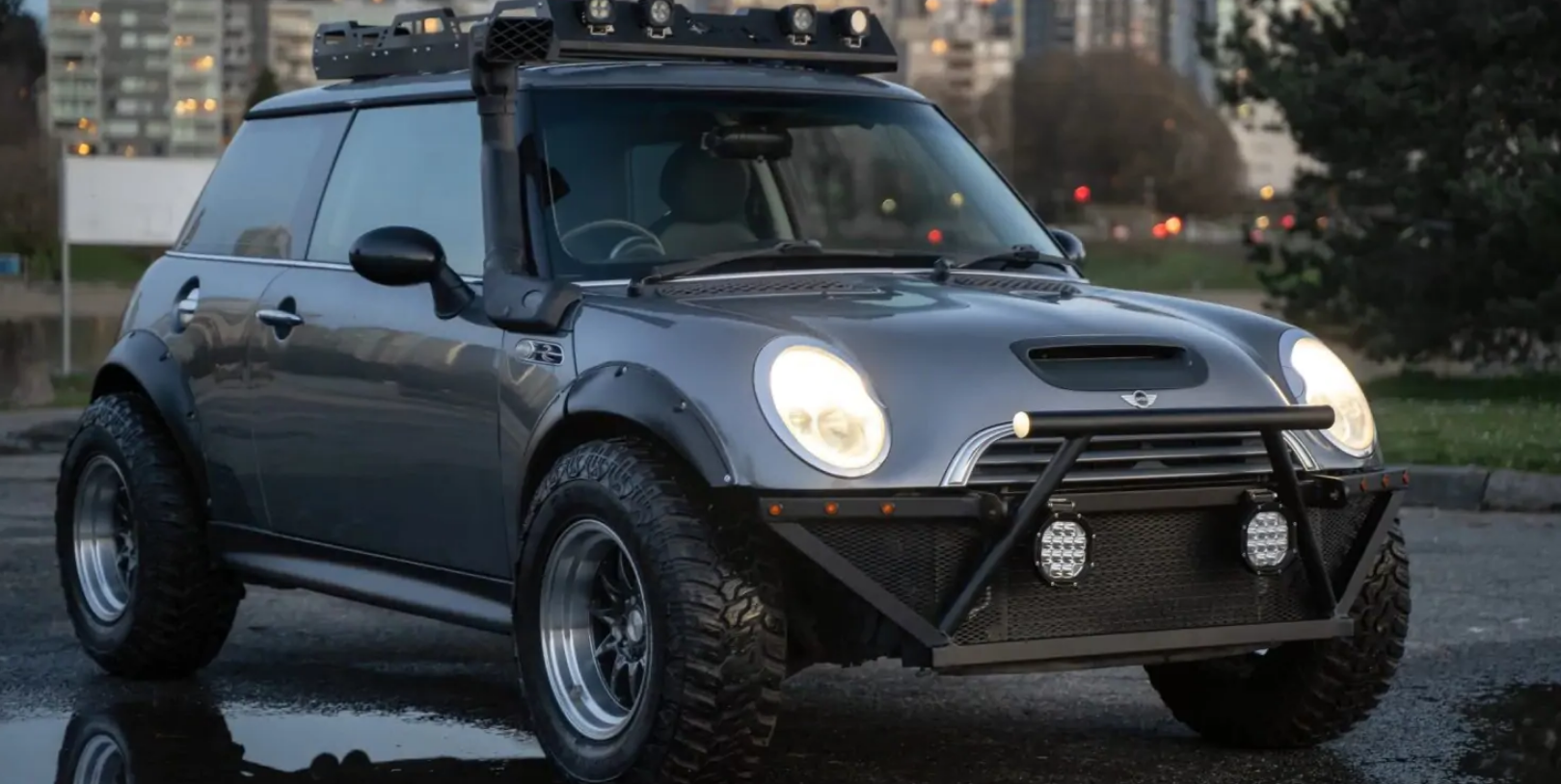 Повідомляється, що йдеться про тюнінговану версію Mini Cooper S 2003 року випуску. Хетчбек має збільшений кліренс, розширені арки, масивні позашляхові шини Maxtrek Mud Trac, шноркель, сталеві бампери з кенгурятниками і багажник на даху.