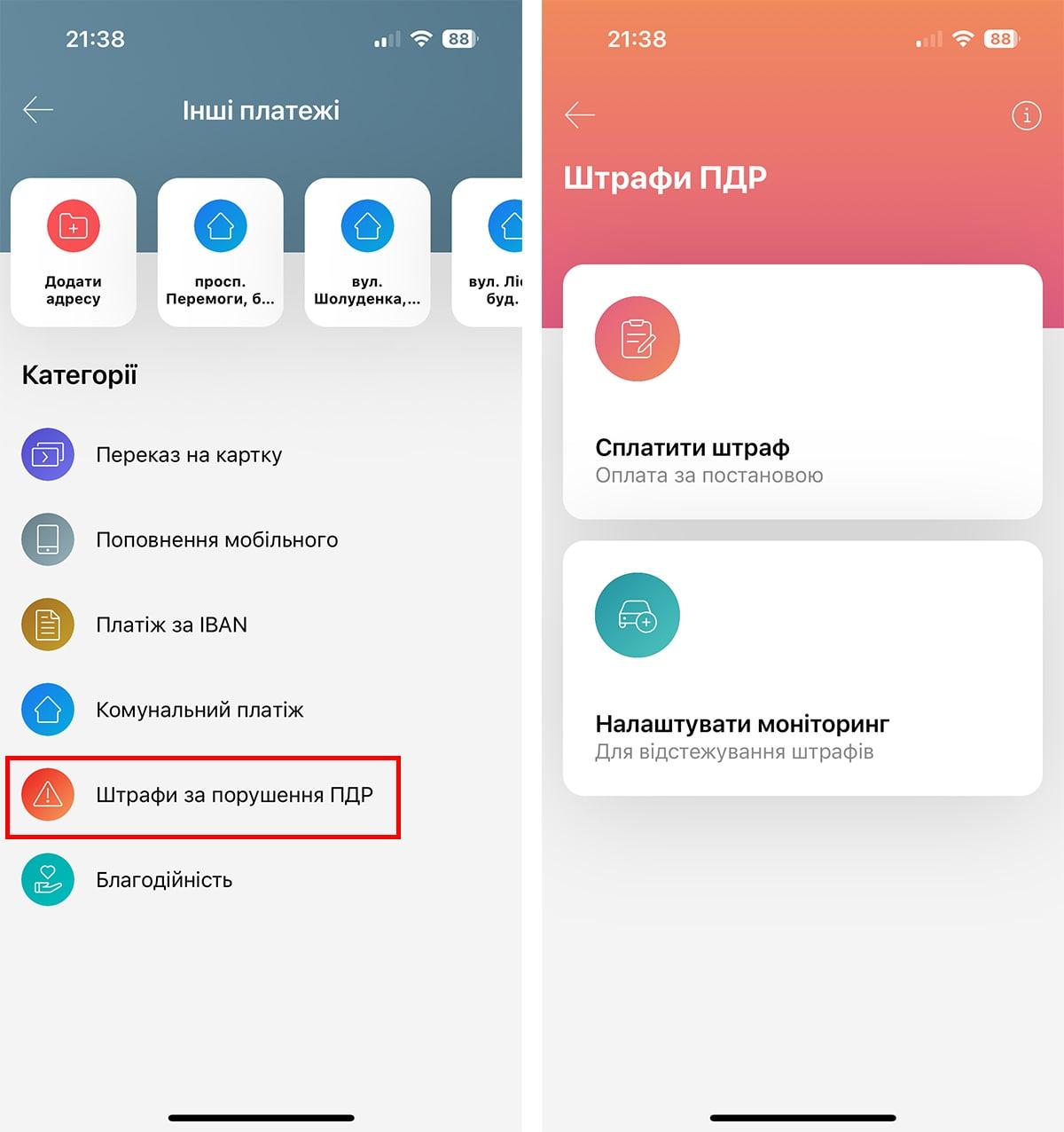 Щоб скористатися цими послугами, слід перейти в розділ “Інші платежі” і обрати “Штрафи за порушення ПДР”.