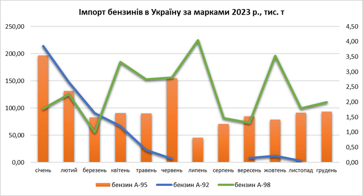 У 2023 році в Україну імпортували 1,249 млн т автобензинів, що практично дорівнює показникам 2022 року і менше на 4% порівняно з 2021 роком.