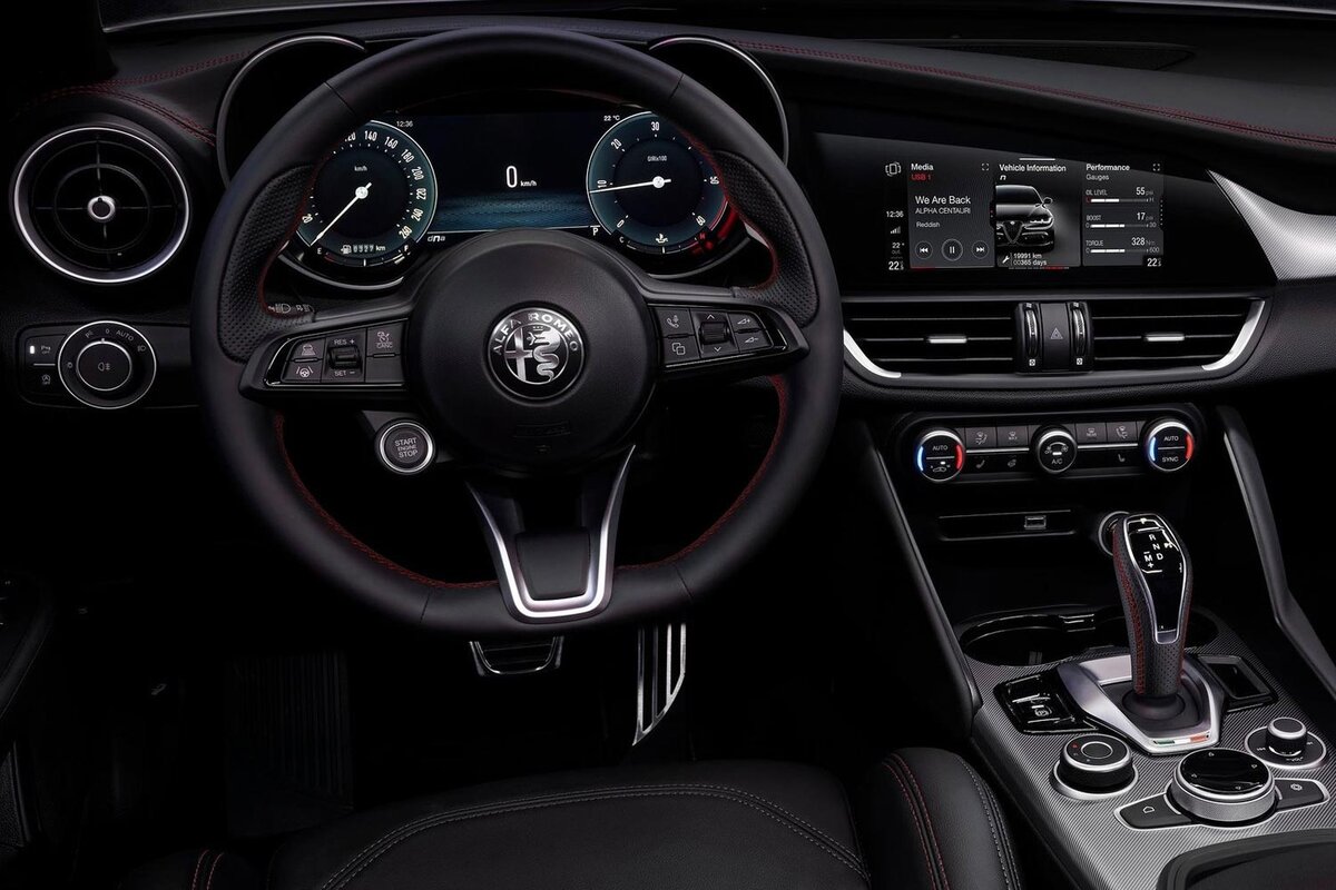 Стильний і потужний седан Giulia з двигуном V6 на 513 к.с. виглядає дорого, але салон не підтримує це враження. Так, дизайн приладової панелі ергономічний, а вентиляційні отвори стилізовані під турбіни, та це не рятує ситуацію.