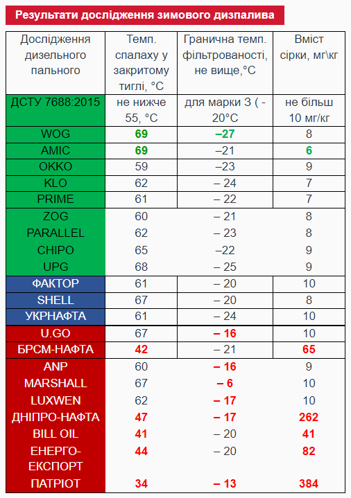 Інститут споживчих експертиз перевірив якість “зимового” дизпалива на різних АЗС українських мереж, таких як AMIC, WOG, KLO, ОККО, UPG, PARALLEL, PRIME, CHIPO, SHELL, УКРНАФТА, ANP, БРСМ-НАФТА, U.GO, MARSHALL. Також вони вивчили невеликі регіональні мережі, такі як ФАКТОР, ZOG, BILL OIL, ЕНЕРГО-ЕКСПОРТ, ДНІПРО-НАФТА, ПАТРІОТ, LUXWEN.