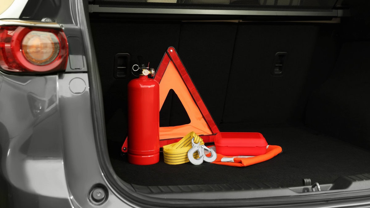 Set of car safety equipment in trunk; Shutterstock ID 2261590513; purchase_order: -; job: -; client: -